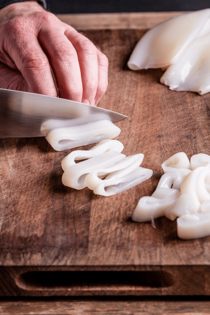 2- Coupez les calamars en anneaux de ¾ de pouce d’épaisseur.