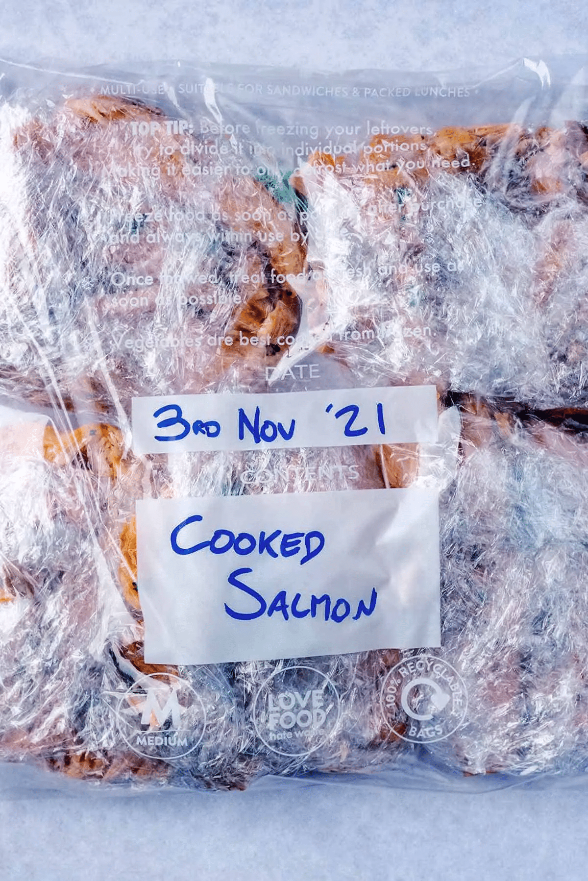 Le saumon cuit se congèle très bien et peut se conserver jusqu’à 3 mois. Une fois qu’il est complètement refroidi, divisez-le en portions individuelles et emballez-le dans du film plastique. Veillez à ce que le poisson soit complètement enfermé. Placez le poisson emballé dans des sacs de congélation, étiquetez et datez le sac et placez-le dans votre congélateur.