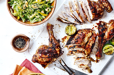 Sucré et collant, un glaçage aromatisé sur la peau du poulet ajoutera beaucoup de saveur supplémentaire. Un simple poulet glacé au miel est la façon la plus simple de commencer, mais vous pouvez ensuite varier les combinaisons ; essayez d’équilibrer le miel sucré avec de la sauce soja salée, ou associez le sirop d’érable avec du sésame aux noix. Pour une touche texane, ajoutez une combinaison audacieuse de clous de girofle moulus, de sirop d’or et d’une bonne dose de bourbon ardent pour obtenir un glaçage qui a de l’allure.