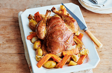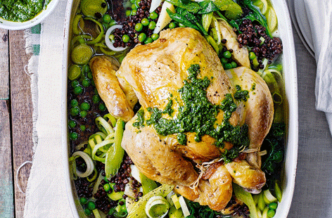 En faisant cuire la viande lentement dans un bouillon, le pot-au-feu permet de garder un poulet succulent et d’y ajouter une multitude de saveurs. Cette recette d’inspiration printanière, à base de poireaux, céleri, panais, petits pois et lentilles, est légère. Ou encore, pour une touche grecque, ce poulet entier, rôti dans une sauce aux tomates et aux olives et servi avec des tagliatelles au beurre, constitue un dîner satisfaisant.