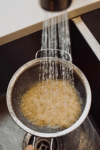 Je vous recommande également d’utiliser une passoire à mailles fines pour rincer votre riz non cuit. Les trous sont trop petits pour laisser passer les grains de riz. De plus, si vous achetez une nouvelle passoire, achetez-en une en métal si vous le pouvez ! Chaque fois que j’ai eu des passoires en plastique, elles se sont toujours déchirées ou ont fondu dans le lave-vaisselle.