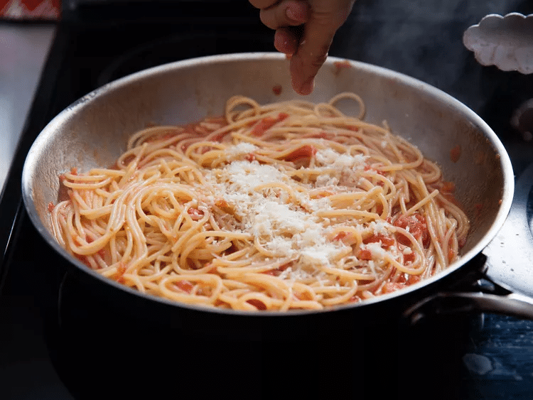 Une fois les pâtes dans la sauce, ajoutez l’eau des pâtes. C’est l’étape la plus importante du processus. L’eau féculente des pâtes n’aide pas seulement à diluer la sauce pour lui donner la bonne consistance ; elle l’aide aussi à mieux adhérer aux pâtes et à s’émulsionner avec les matières grasses et le fromage que vous allez ajouter. Quelle que soit la sauce que vous préparez, qu’il s’agisse d’une marinara épaisse, d’un ragù bolognese riche et consistant ou d’un simple carbonara, elle doit acquérir une texture crémeuse qui adhère aux nouilles.