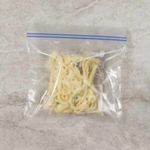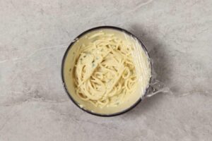*Si vous n’avez pas de film plastique, vous pouvez également couvrir le bol avec une serviette en papier mouillée. L’humidité favorisera la formation de vapeur et aidera à chauffer les pâtes.