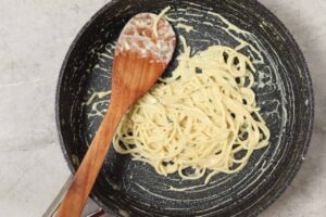4– Une fois la sauce réémulsionnée, retirer les pâtes du feu et servir.