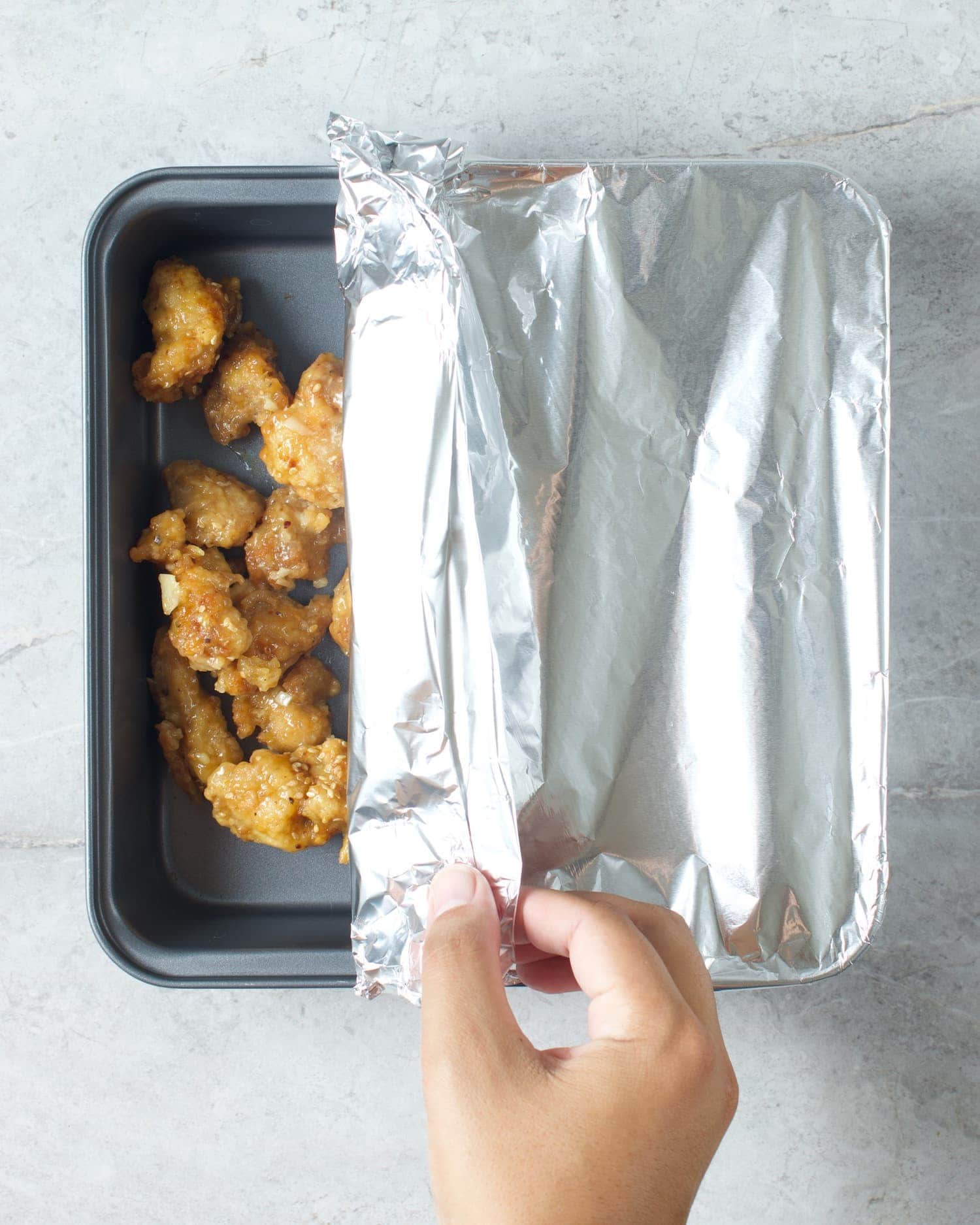 Couvrir le plat d’une feuille d’aluminium empêchera le poulet à l’orange de se dessécher pendant le processus de réchauffage, mais vous devez l’enlever vers la fin si vous ne voulez pas que la pâte soit détrempée.