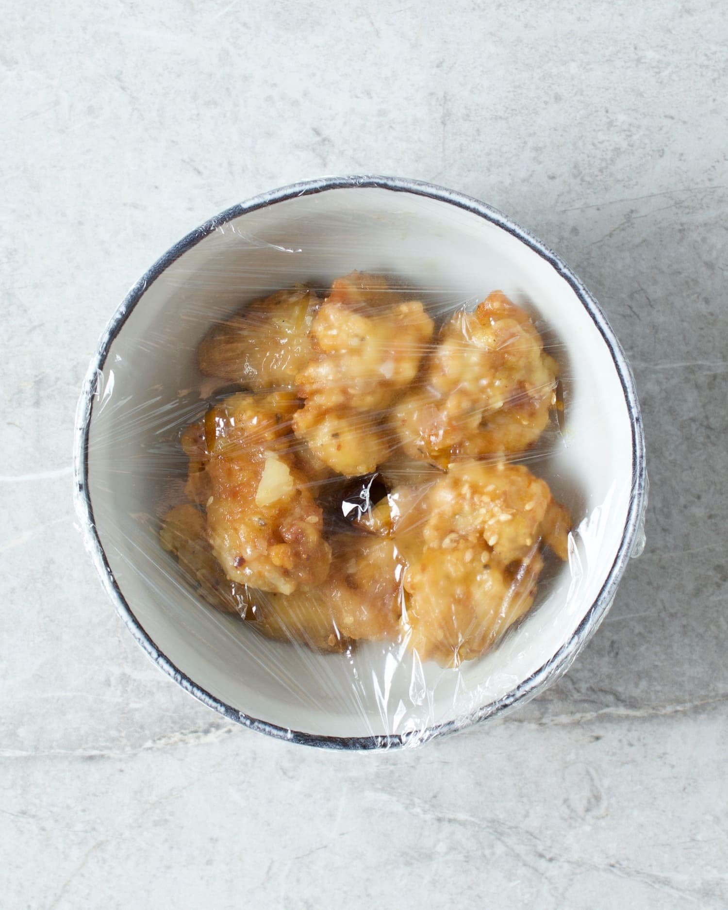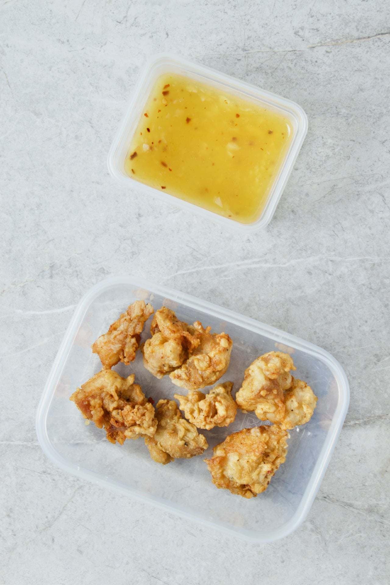 Si vous savez que vous allez avoir des restes, ne saucez que le poulet que vous allez manger. Vous pouvez également demander aux plats à emporter de vous livrer la sauce et le poulet dans des récipients séparés. Conservez ensuite la sauce et le poulet séparément. Le poulet restera ainsi aussi croustillant que possible, car la sauce ne s’infiltrera pas dans la panure.