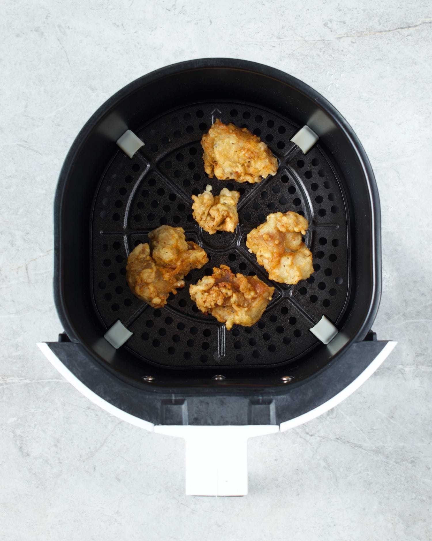 1– Réglez votre friteuse à 200°C (390°F) et placez les morceaux de poulet dans le panier de la friteuse.