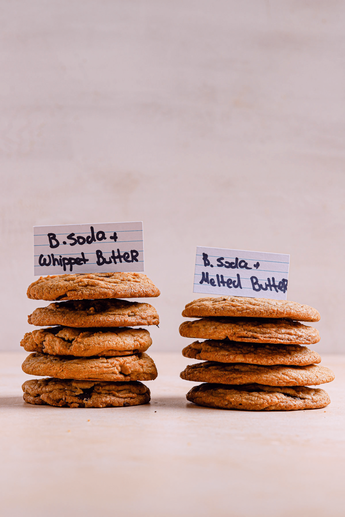 J’ai utilisé cette recette de biscuits moelleux aux pépites de chocolat pour démontrer la différence entre les deux poudres. Je l’ai cuite de quatre façons différentes : bicarbonate de soude uniquement, levure chimique uniquement, levure chimique et bicarbonate de soude, et bicarbonate de soude uniquement et beurre fondu.