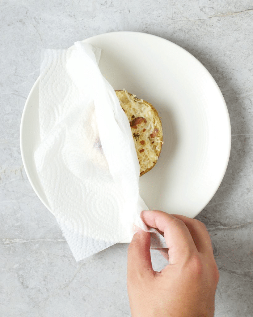L’utilisation d’une serviette en papier humide empêchera la garniture de la pomme de terre de se dessécher. Sans cela, la peau peut également devenir très dure.