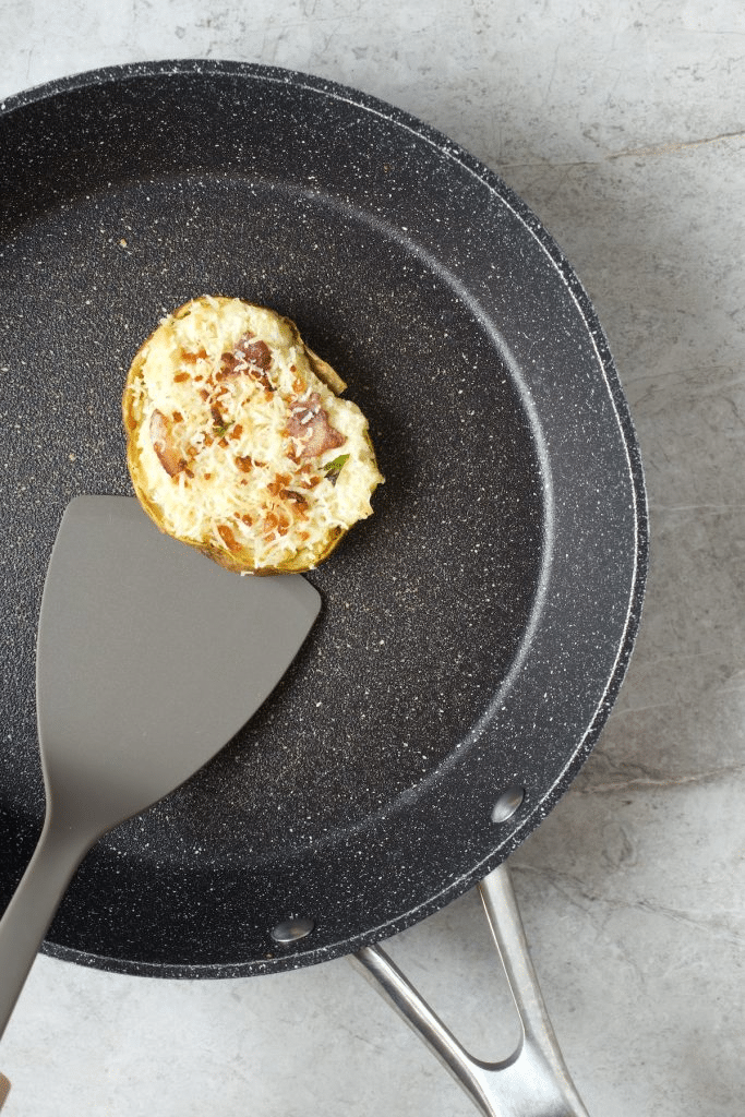 Je pense que cette méthode fonctionnera mieux avec de petites pommes de terre cuites deux fois au four (moins de garniture). Les plus grosses pourraient prendre trop de temps à chauffer jusqu’au milieu (bien que vous puissiez toujours les passer au micro-ondes d’abord).