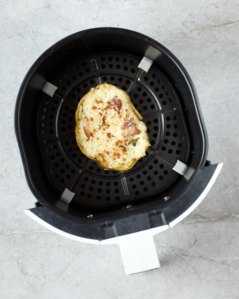 Sortez vos pommes de terre au four du réfrigérateur et laissez-les atteindre la température ambiante. Réglez votre friteuse à 350°F (180°C) et retirez les garnitures froides telles que la crème aigre. Placez les pommes de terre dans le panier de la friteuse. Ajoutez éventuellement des garnitures supplémentaires (comme du fromage). Réchauffez-les pendant 4 à 5 minutes.
