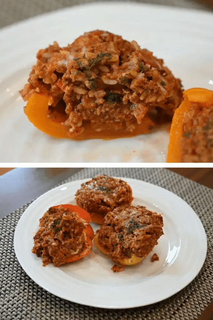 5– Si vous souhaitez que les poivrons farcis deviennent plus tendres et sucrés avec le dessus bruni, retirez le papier d’aluminium et faites cuire les poivrons pendant environ 15 minutes, en veillant à ce que la température interne ne dépasse pas 185 F.