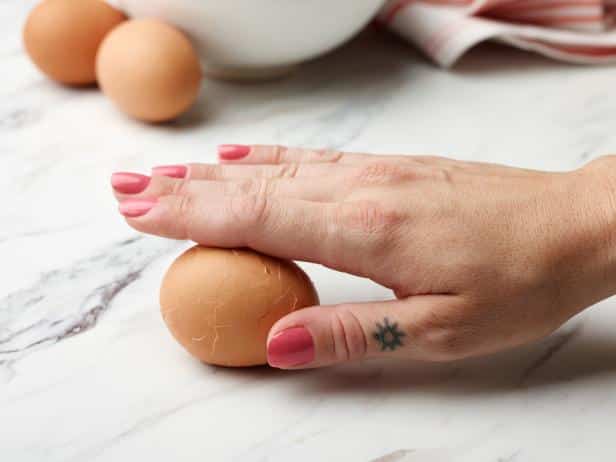 Roulez délicatement l’œuf entre vos mains pour détacher la coquille. Notez que si vous épluchez des œufs à la coque plus mous, vous devrez sauter cette étape car les œufs sont plus fragiles et risquent de se déchirer.