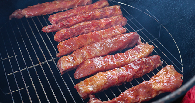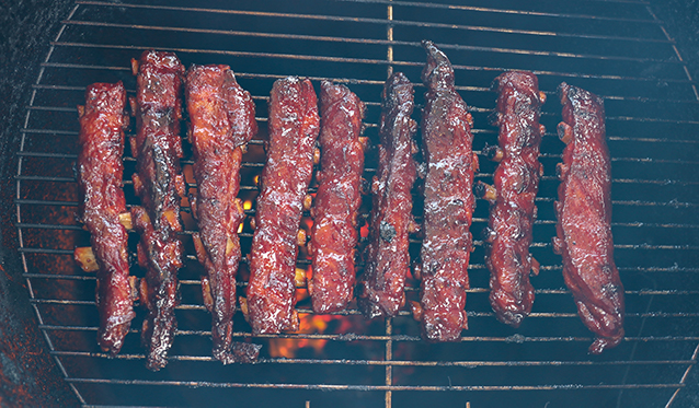 Les riblets sont des sections transversales de côtes de longe de porc, coupées en fines lanières d’environ 2 pouces de large, qui constituent une parfaite portion de côtes pour l’apéritif. Je les ai traités comme s’il s’agissait de mini-côtes de porc. Chaque morceau a été assaisonné d’un peu de sel casher et, pour l’assaisonnement barbecue, j’ai opté pour le Butcher’s BBQ Honey Rub. Vous pouvez utiliser n’importe quel assaisonnement sur ces riblets, mais je voulais une saveur douce et l’assaisonnement au miel était parfait.
