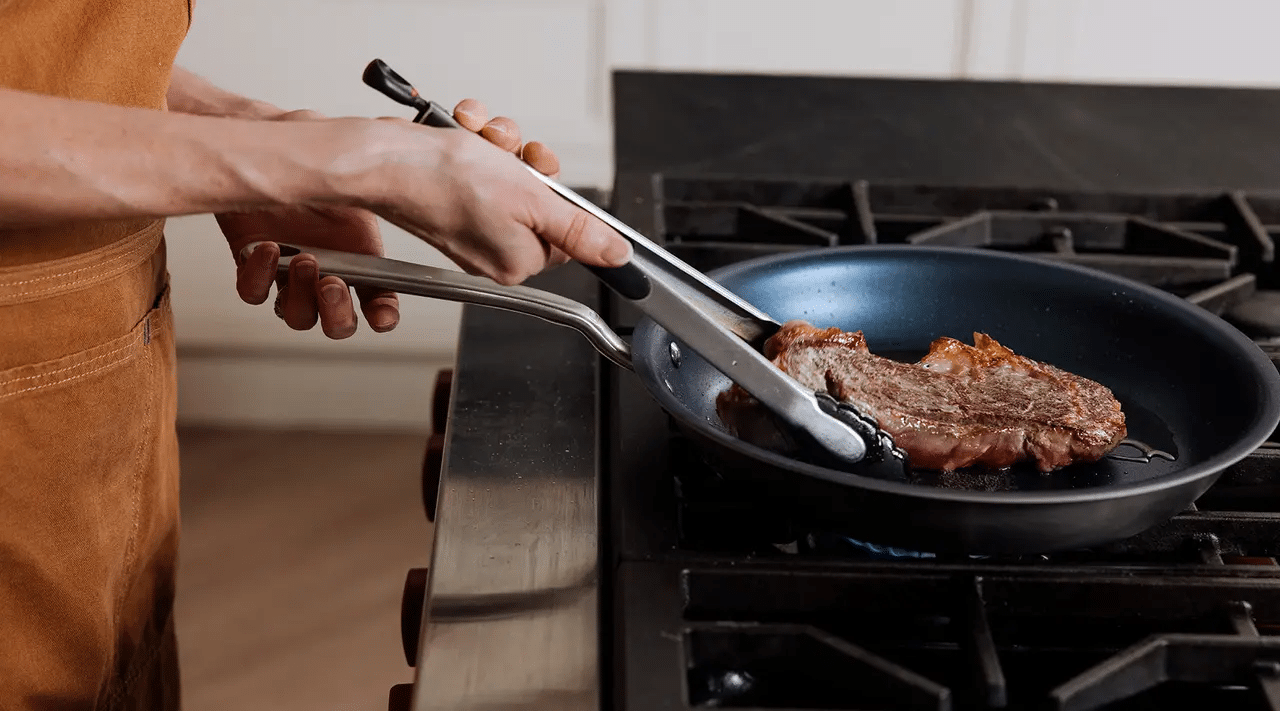 L’un des principaux arguments que vous avez peut-être entendu à l’encontre des poêles antiadhésives est qu’elles ne doivent pas être utilisées à feu vif. Ce n’est que partiellement vrai : si le fait de soumettre régulièrement votre ustensile antiadhésif à une cuisinière ou à un four très chaud peut endommager le revêtement – et le fera -, il est tout à fait possible d’augmenter la chaleur de temps en temps si votre poêle est conçue pour résister à des températures élevées, comme la nôtre. Et comme un bon steak est un plaisir occasionnel, vous n’aurez probablement pas besoin de le faire très souvent.