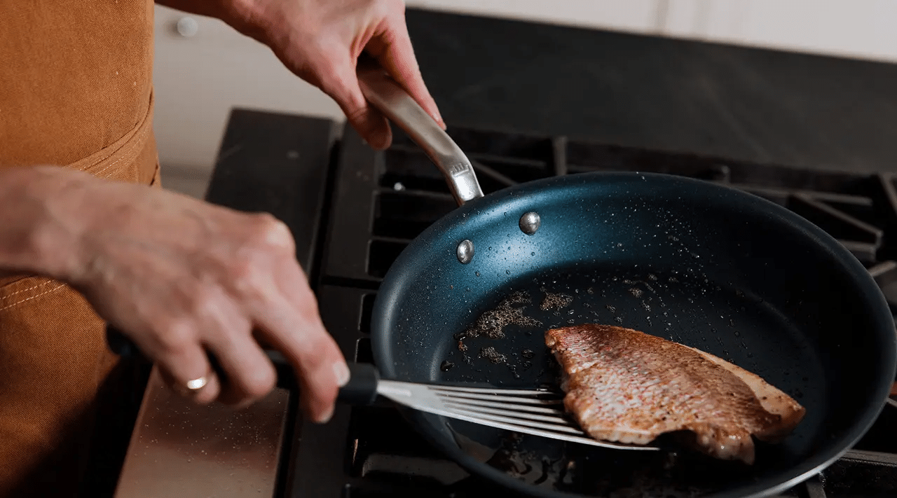 Plutôt que de préchauffer une poêle vide, comme vous le feriez avec de la fonte, de l’acier inoxydable ou de l’acier au carbone, vous devez ajouter vos protéines dans une poêle froide.