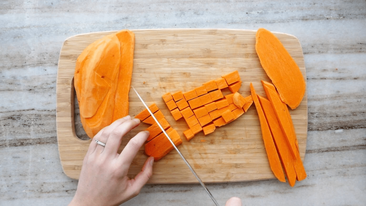 COMMENT COUPER LES PATATES DOUCES EN CUBES