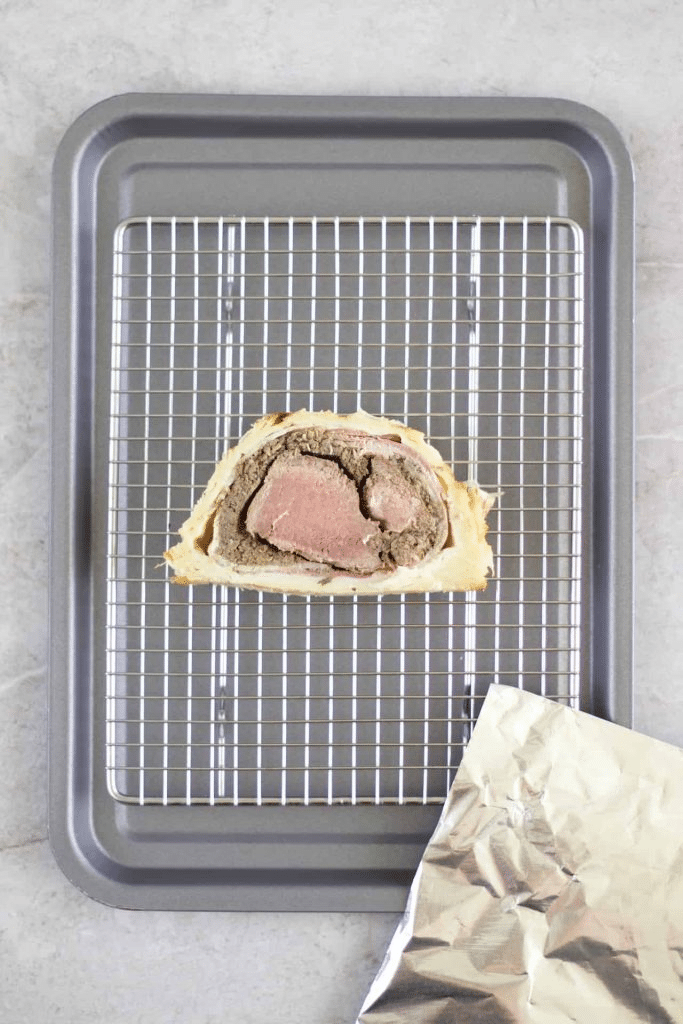 J’aime faire reposer mon Wellington sur une grille afin que la pâte ne reste pas trop longtemps dans une mare de liquide. Cela permet également de répartir uniformément la chaleur autour du Wellington. Le papier d’aluminium garde la viande humide, mais il ne faut pas emprisonner toute la vapeur, sinon la pâte sera détrempée (d’où les évents).