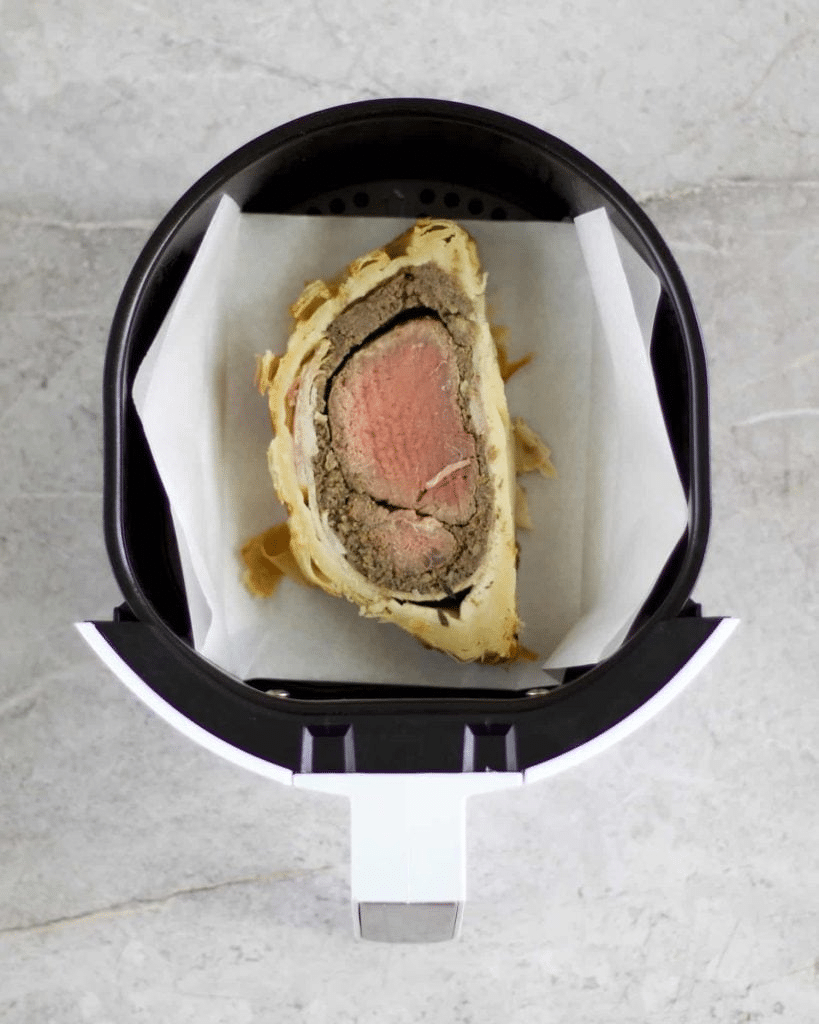 Cependant, le fait de recouvrir la friteuse de papier sulfurisé gêne la circulation de l’air, et vous devrez donc retourner la tranche de pain Wellington à mi-chemin du chauffage.
