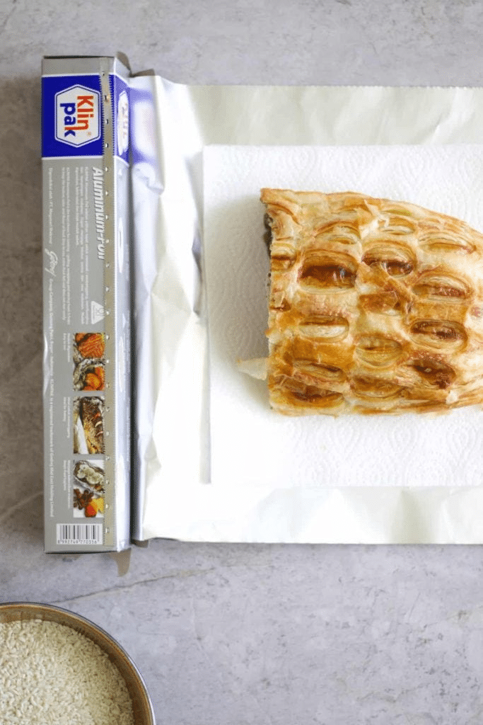 Le principal problème lié à la conservation d’un bœuf Wellington entier est d’obtenir un fond détrempé. Mais vous pouvez l’éviter grâce à une astuce astucieuse. Préparez un lit de riz et couvrez-le d’une serviette en papier. Le riz crée un lit poreux dans lequel les jus s’écoulent et l’essuie-tout empêche le riz de coller au fond du pain Wellington.