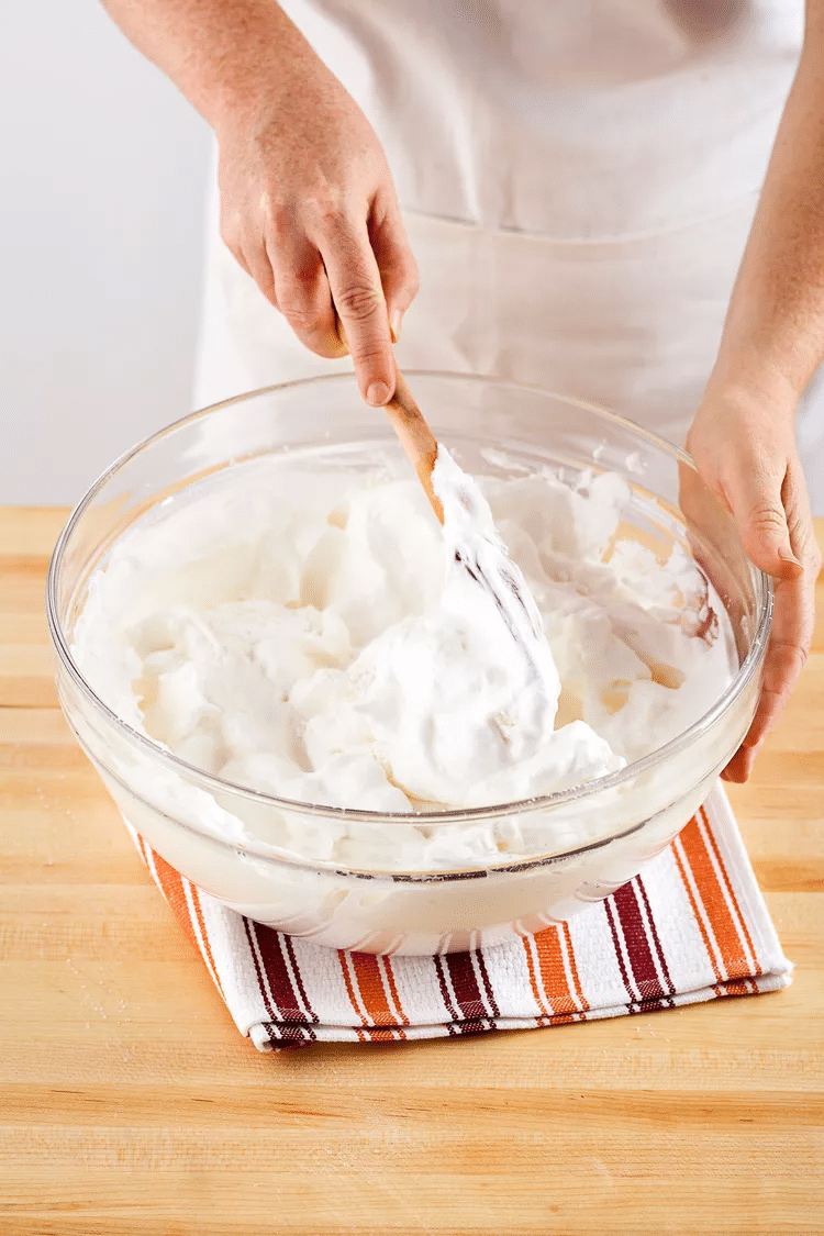 Incorporer le mélange de farine tamisé, un quart à la fois, aux blancs d’œufs. Pour plier :
