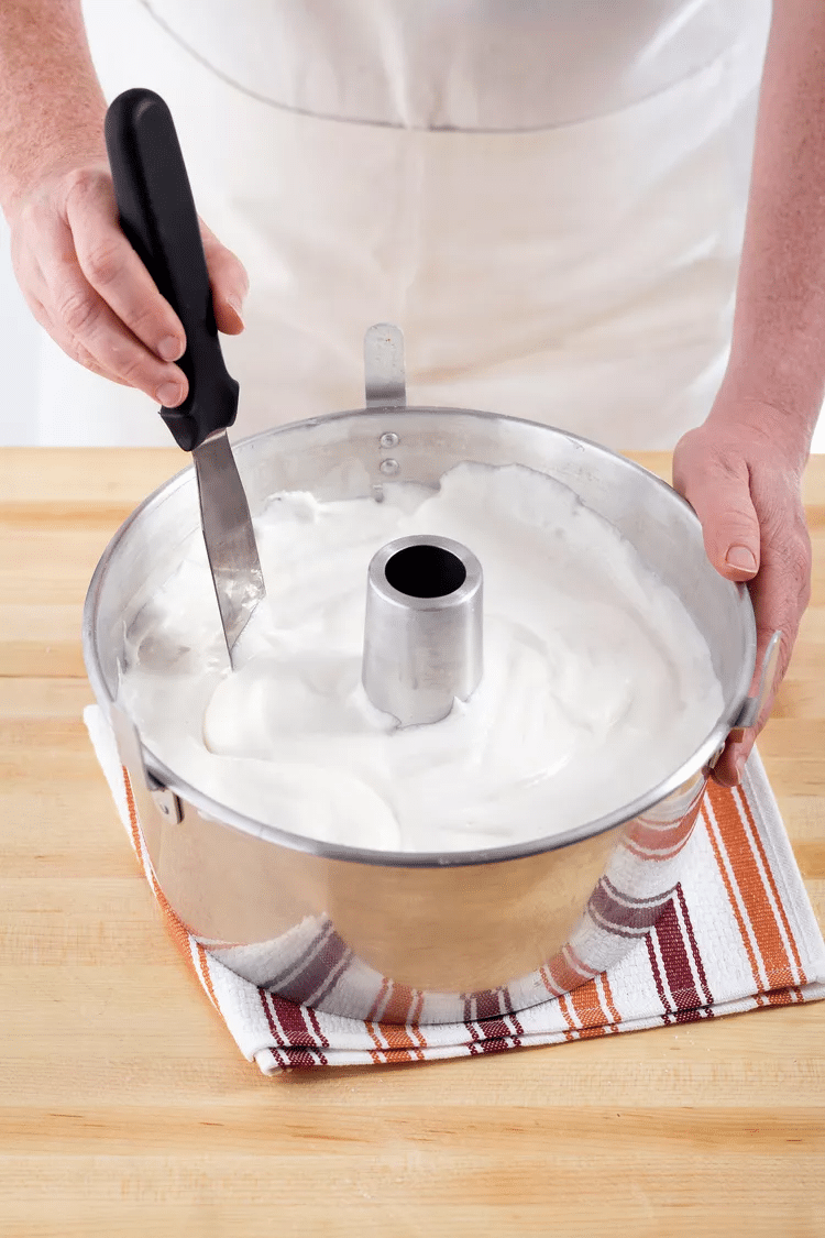 Pour obtenir une texture de gâteau fine et uniforme, éliminez les grosses bulles d’air en coupant délicatement la pâte à l’aide d’une fine spatule métallique après l’avoir versée dans un moule tubulaire non graissé (16 $, Bed Bath & Beyond). Mais si vous n’avez pas de moule tubulaire, pouvez-vous faire un gâteau des anges dans un moule à manqué ? On pourrait croire que les deux sont interchangeables, mais les détails complexes de la plupart des moules à pain font qu’il est très difficile de sortir un gâteau des anges du moule en un seul morceau. Les moules tubulaires ont un fond plat et des parois droites pour faciliter le démoulage du gâteau, et la pâte s’accroche aux parois et au tube central lorsque le gâteau cuit, ce qui l’aide à lever. Dans la mesure du possible, optez donc pour un moule à charnière.