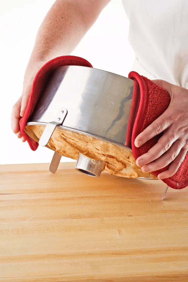 * Pour refroidir votre gâteau des anges, retournez toujours le moule de manière à ce que le côté ouvert soit tourné vers le bas. Le gâteau des anges continuera à se solidifier en refroidissant, et si vous ne le retournez pas pour qu’il finisse de refroidir, il risque de s’affaisser et de couler dans le moule.