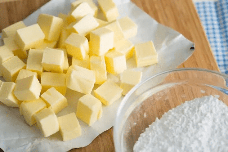 Pour le beurre, coupez-le en cubes et laissez-le reposer jusqu’à ce qu’il soit malléable mais pas fondu.