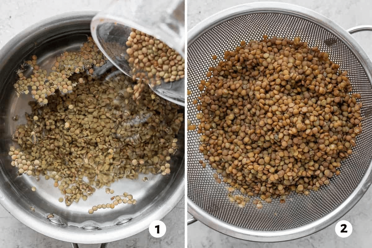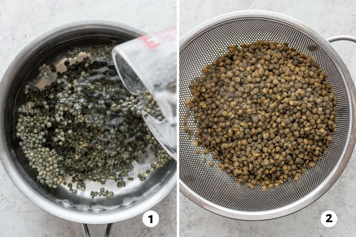 1– Rincer les lentilles et les mettre dans une casserole d’eau bouillante salée. Couvrir, réduire le feu et laisser mijoter en remuant de temps en temps jusqu’à ce qu’elles soient tendres. Cette variété est la plus longue à cuire.