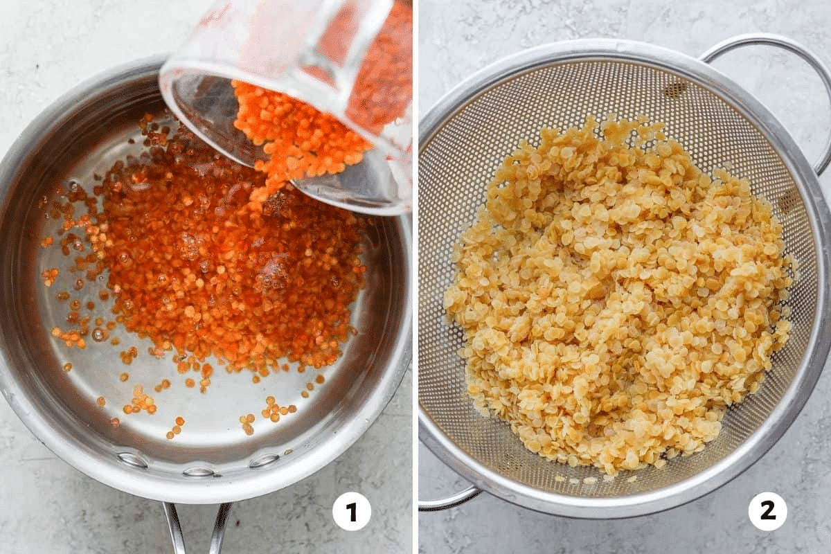 1– Rincer les lentilles rouges en éliminant les petits cailloux et réserver les lentilles. Porter à ébullition une casserole d’eau salée et ajouter les lentilles.