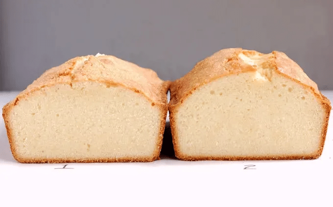* À titre de contrôle, j’ai d’abord préparé un quatre-quarts en utilisant uniquement les quatre ingrédients d’origine et la méthode de la crème inversée. Comme pour les tests précédents, le gâteau était assez dense, avec une mie tendre et moelleuse et un goût légèrement plat.