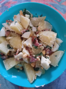 Sa salade de pommes de terre était similaire à ma salade de pommes de terre, mais elle utilisait ce qu’elle avait sous la main. Elle l’a préparée avec des pommes de terre, des œufs, du bacon, des épinards hachés et de la mayonnaise aux œufs entiers.