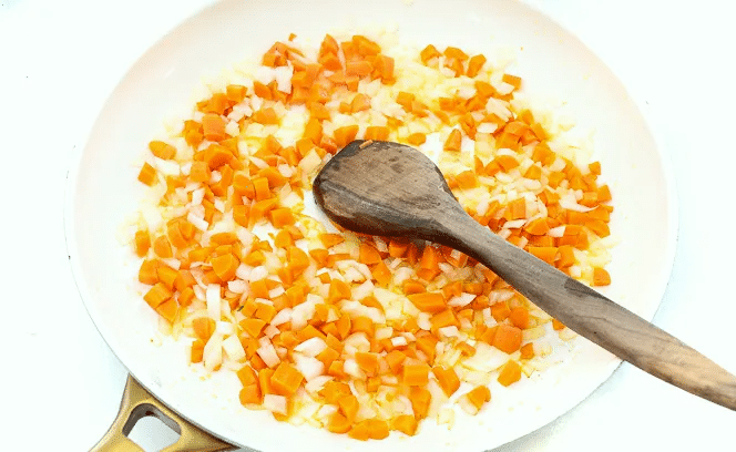 * Retirez-les de la poêle et mettez-les de côté. Ajouter la cuillère à soupe de beurre restante dans la poêle. Ajouter les carottes et l’oignon et cuire jusqu’à ce qu’ils soient tendres, 3-4 minutes. Incorporer l’ail et cuire pendant une minute supplémentaire.