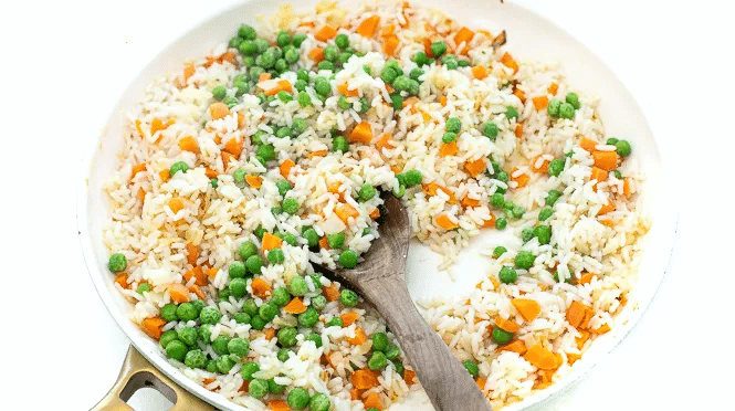 Faire sauter pendant 3 à 4 minutes après avoir ajouté le riz et les petits pois refroidis. Il faut s’attendre à ce que le riz brunisse un peu.