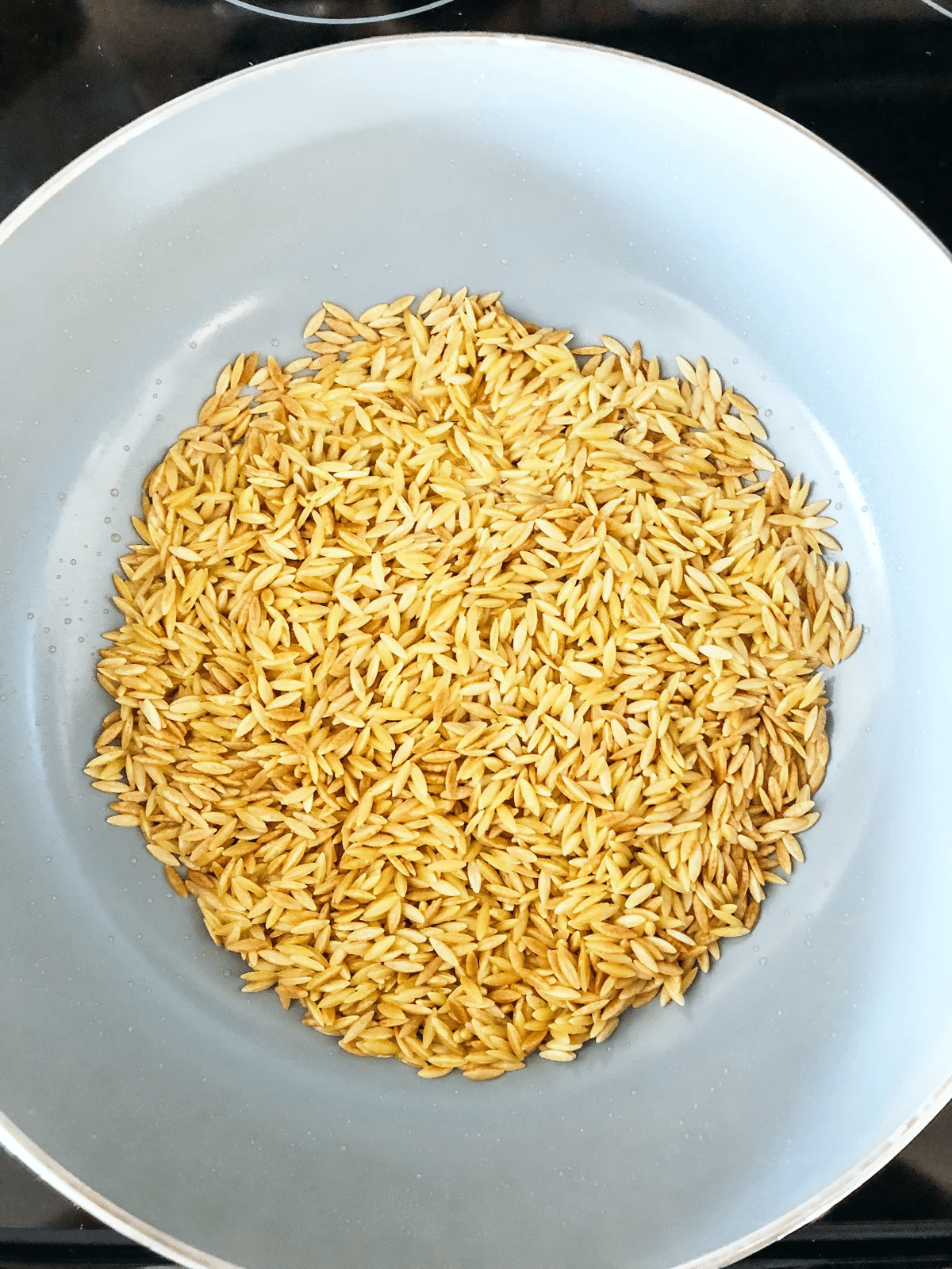 L’orzo est très facile à préparer. Vous pouvez le faire bouillir comme des pâtes ordinaires et égoutter l’eau, mais je préfère le préparer dans une poêle. Lorsque l’orzo est préparé dans une poêle, vous avez la possibilité de lui donner une riche saveur grillée en le faisant d’abord griller dans du beurre fondu. Dans l’image ci-dessous, vous pouvez voir des morceaux d’orzo légèrement grillés qui rendent ces pâtes encore plus savoureuses !